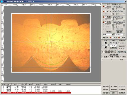 本軟件提供了“拋物線(xiàn)”、“橢圓”、“雙曲線(xiàn)”、“多項(xiàng)式”、“距離”、“角度”等六種測(cè)量工具及測(cè)量方法,可完成長(zhǎng)度、面積、角度等測(cè)量工作。前4種工具用戶(hù)可輸入解析方程的參數(shù),軟件將自動(dòng)生成測(cè)量工具,用戶(hù)可用移動(dòng)該工具,對(duì)需要檢測(cè)的形態(tài)特征位置進(jìn)行對(duì)比。